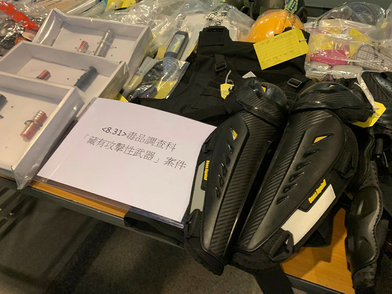 香港警方在1日凌晨的发布会上通报,警方31日中午,在铜锣湾一间酒店房间检获一批头盔、装甲、防毒口罩等装备,及超过四万元现金,以涉嫌藏有攻击性武器拘捕三名年龄介于16至26岁男子。