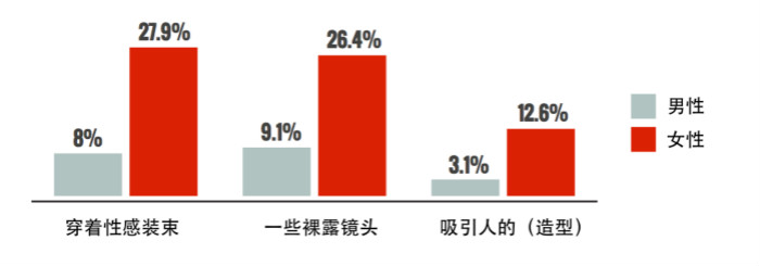 同时,对于女性角色来说,她们的身体有时候比演技更能成为卖点。据统计,2014年的100部热门影片中,女性角色普遍比男性角色更常穿着性感的服装(女性:27.9% vs.男性8%),更常出现部分或全部裸露的镜头(女性26.4% vs. 男性9.1%),以及更常被包装成外表迷人的造型(女性12.6% vs.男性3.1%)。