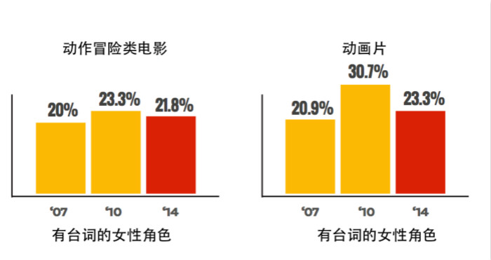 在所有的电影流派中,动作冒险类电影与动画片中有台词的女性角色均少于四分之一,虽然在2010年动画片中女性角色的数量达到了30.7%,但是在2014年,这个数字又重新跌落到四分之一以下。
