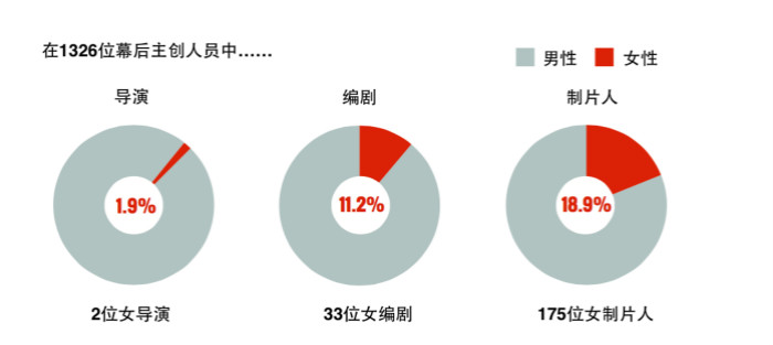 而在美国的电影幕后工作人员中,男女比例更是严重失衡。在2014年100部大热影片中幕后共有1326名主创人员。其中,仅有两名女导演(占导演总数不到2%),33位女编剧(占编剧总数的11.2%),以及175位女制片人(占制片人总数的18.9%)。