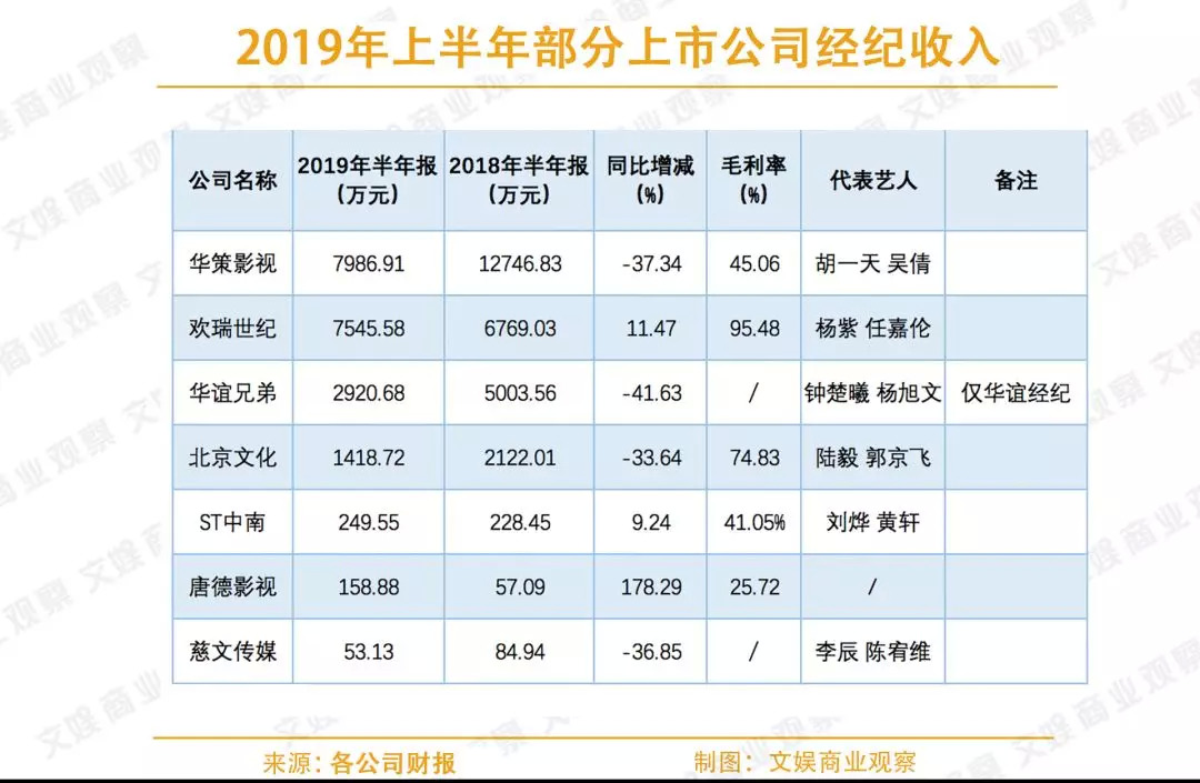这从2019年影视公司半年报的数据中也可以直观的反映出来,在单独披露艺人经纪收入的7家影视公司中,有4家艺人经纪的收入处于下降状态,且下降幅度超过30%,主流的传统艺人经纪强势公司绝大部分已经连续2年剧降。