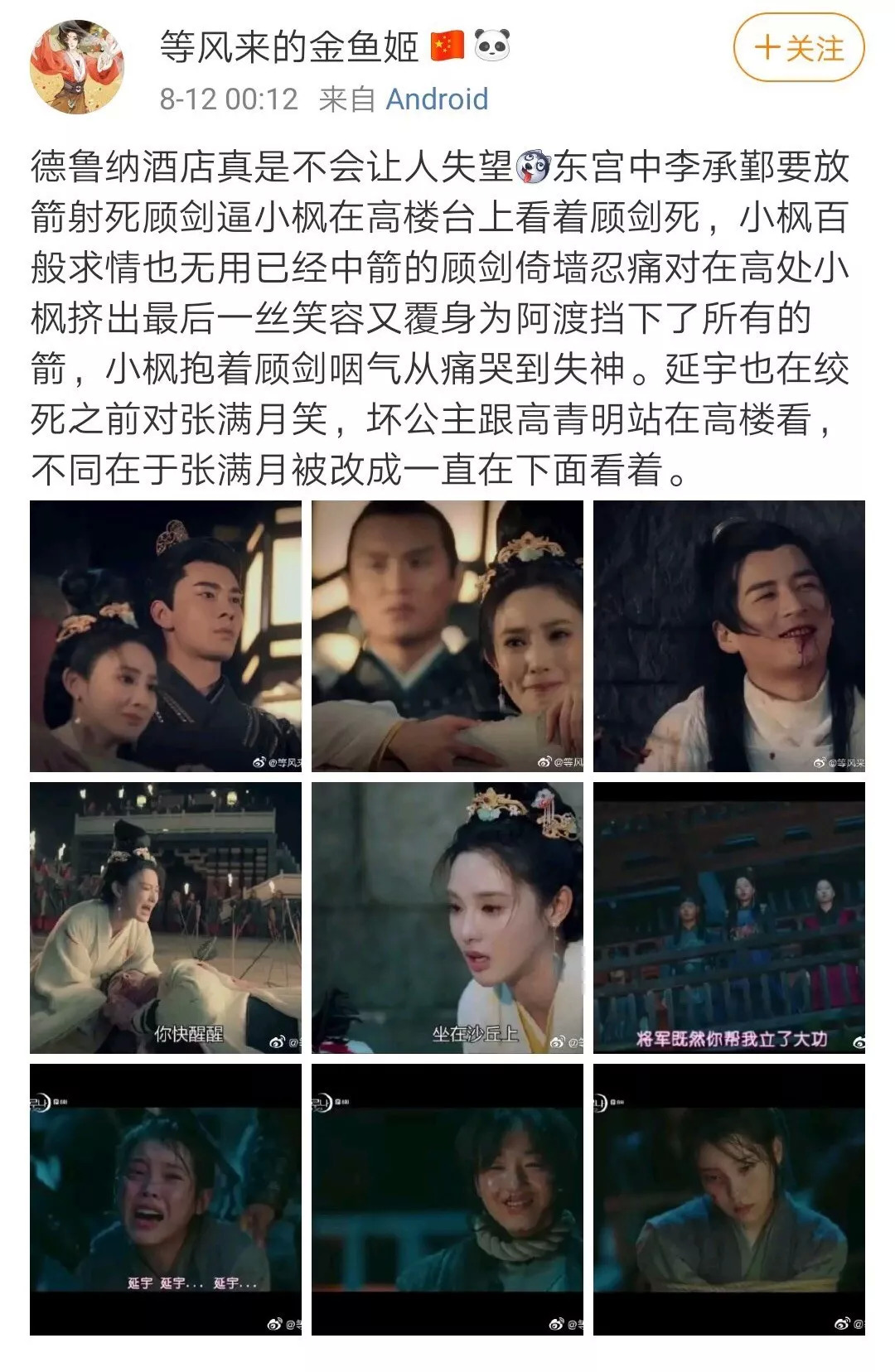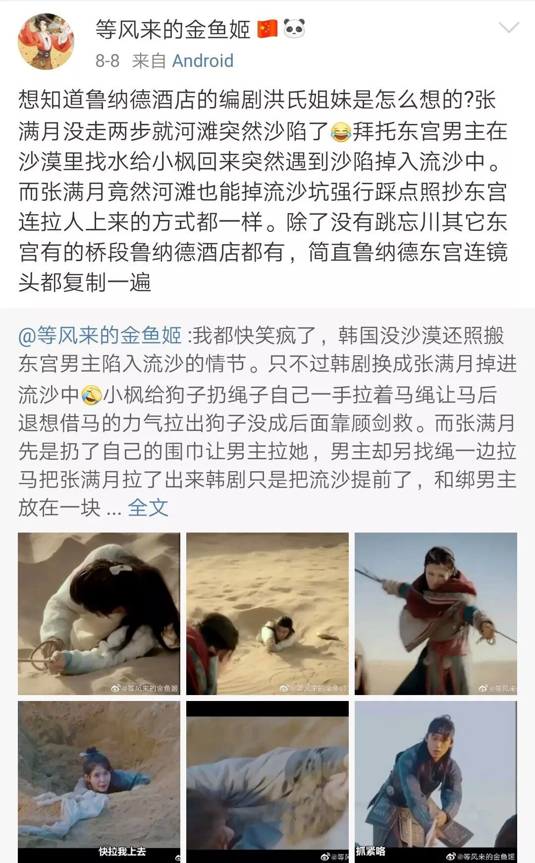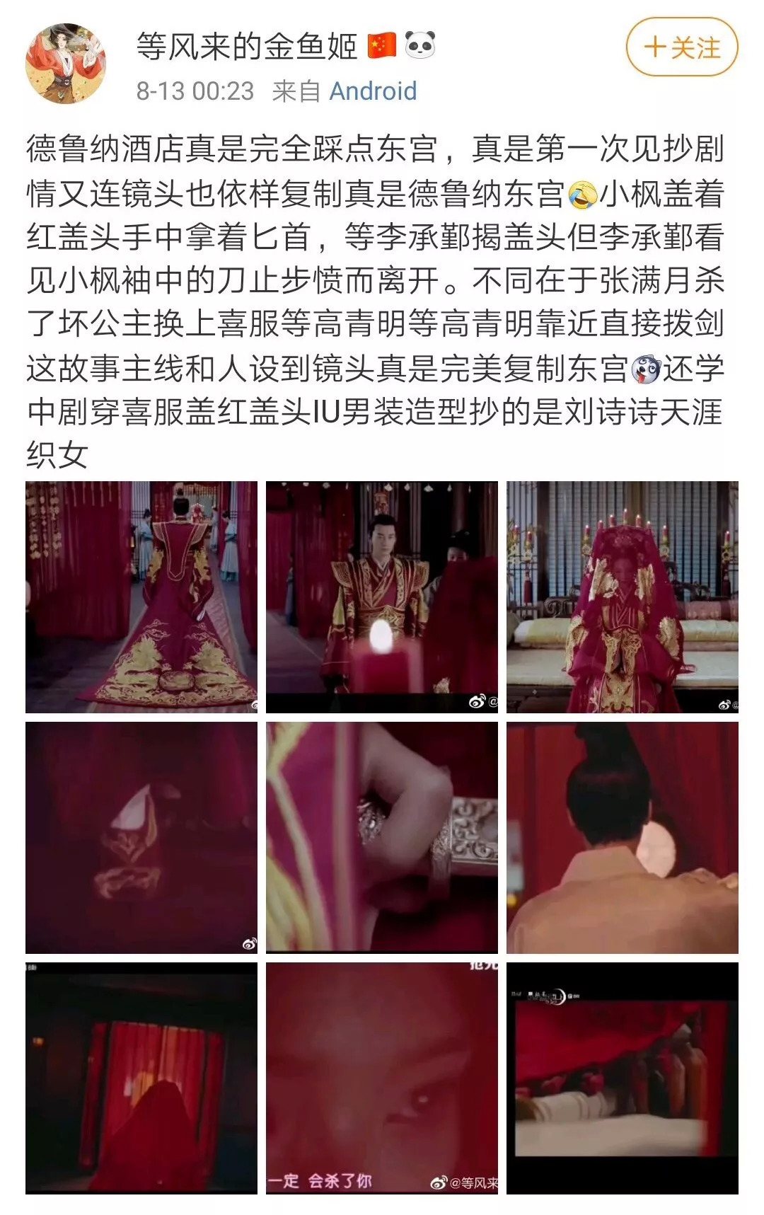 根据微博网友@等风来的金鱼姬的整理对比,《德鲁纳酒店》古代部分的多处情节跟《东宫》惊人的相似。