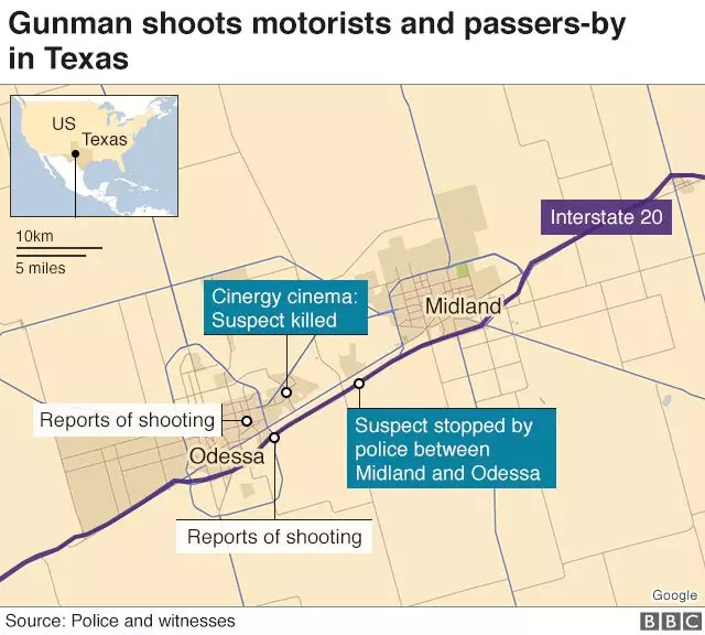 据Globalnews报道,敖德萨市警察局局长格克(MIchael Gerg)表示,警方认为枪击始于下午4点17分左右,当时德州公共安全部门的两名官员试图在米德兰高速公路上,要求一辆金色本田车靠边泊车,接受检查,结果遭到司机枪击,并且嫌疑人随及开车进入敖德萨市,开始不断向周围其他车辆及行人开火。