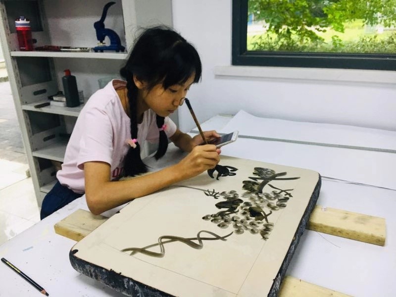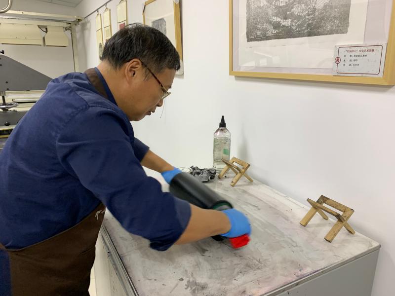 定位、打墨、上墨、印刷……新开设的“石印工坊”内,技艺传承人顾雪根为人们演示石版画的制作过程。以石板为版材,利用水油不相混合原理,将图文描绘或转印在石板之上,最终进行印刷,这便是石版印刷技术。