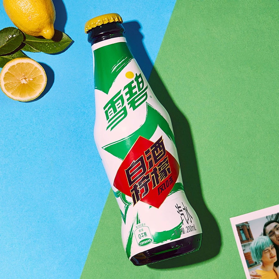 最近,食品饮料行业也开始出现酒精饮料的联名趋势:不久前雪碧推出了一款白酒柠檬口味的汽水,据说口感有柠檬汽水和高粱酒的风味,不过它是不含酒精的,且热量为0卡,包装也是复古的玻璃瓶。