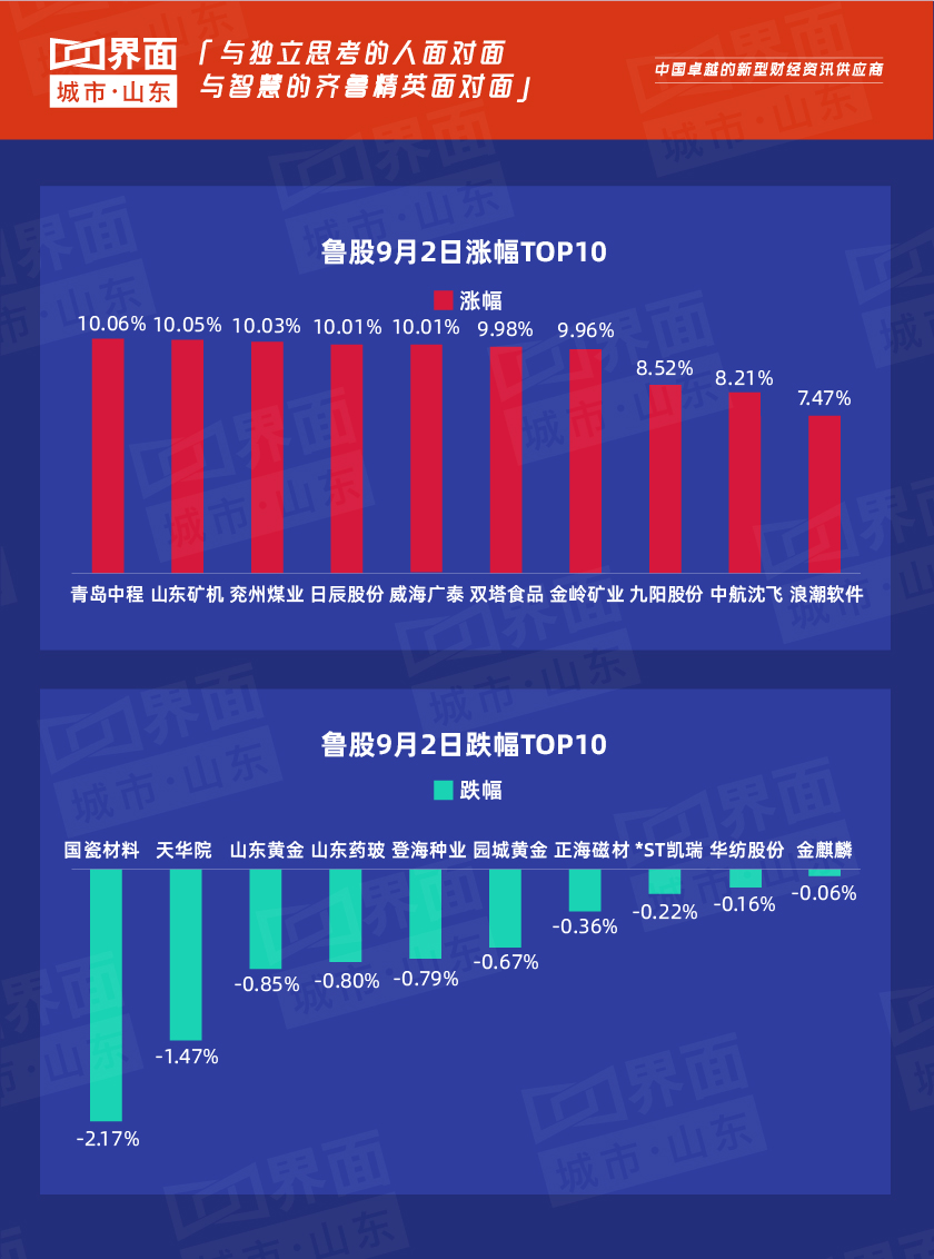 9月2日,山东省内沪深股票有194只个股上涨,10只下跌,1只与上一个交易日收盘价持平;青岛中程(300208)涨停领跑山东板块,此外,山东矿机(002526)、兖州煤业(600188)、日辰股份(603755)、威海广泰(002111)等个股均涨停。