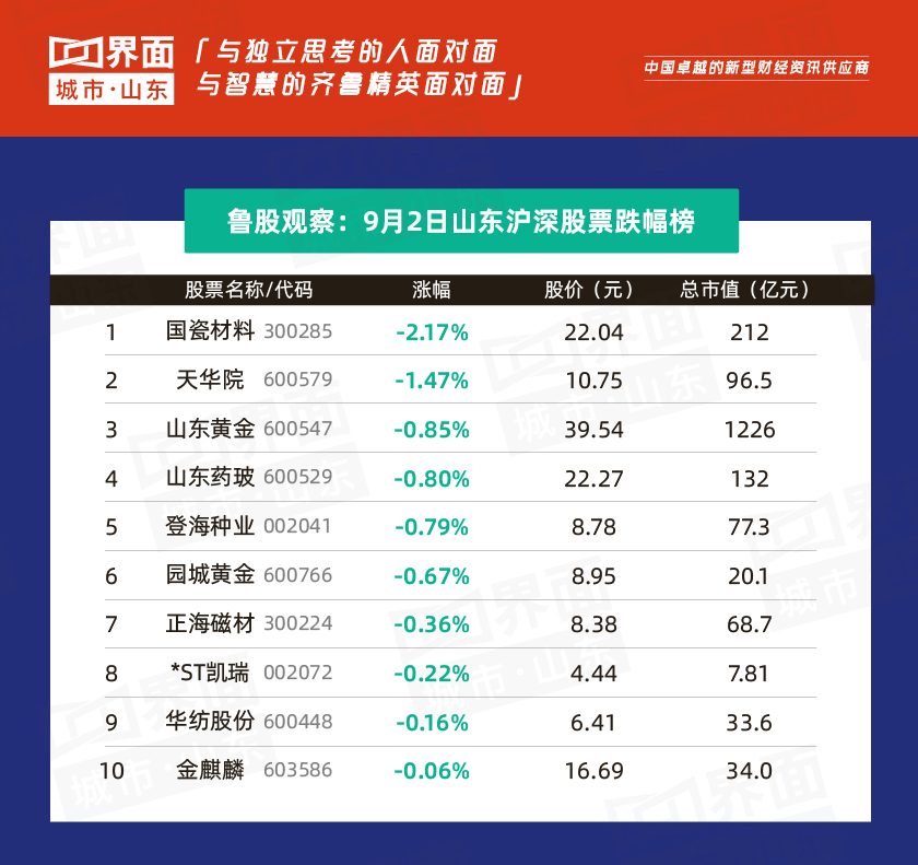 济南市跌幅榜首:山东黄金(600547),涨幅-0.85%,股价39.54元,总市值1226亿元。