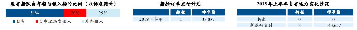 上半年,中远海控的船队规模稳步提升,运力规模比2018年底增长5%,平均船龄10.2年,单船平均运力5876标准箱。报告期内共计8艘大型集装箱船舶交付使用,合计运力14.4万标准箱,分别投入其西北欧、美东、中东等航线。