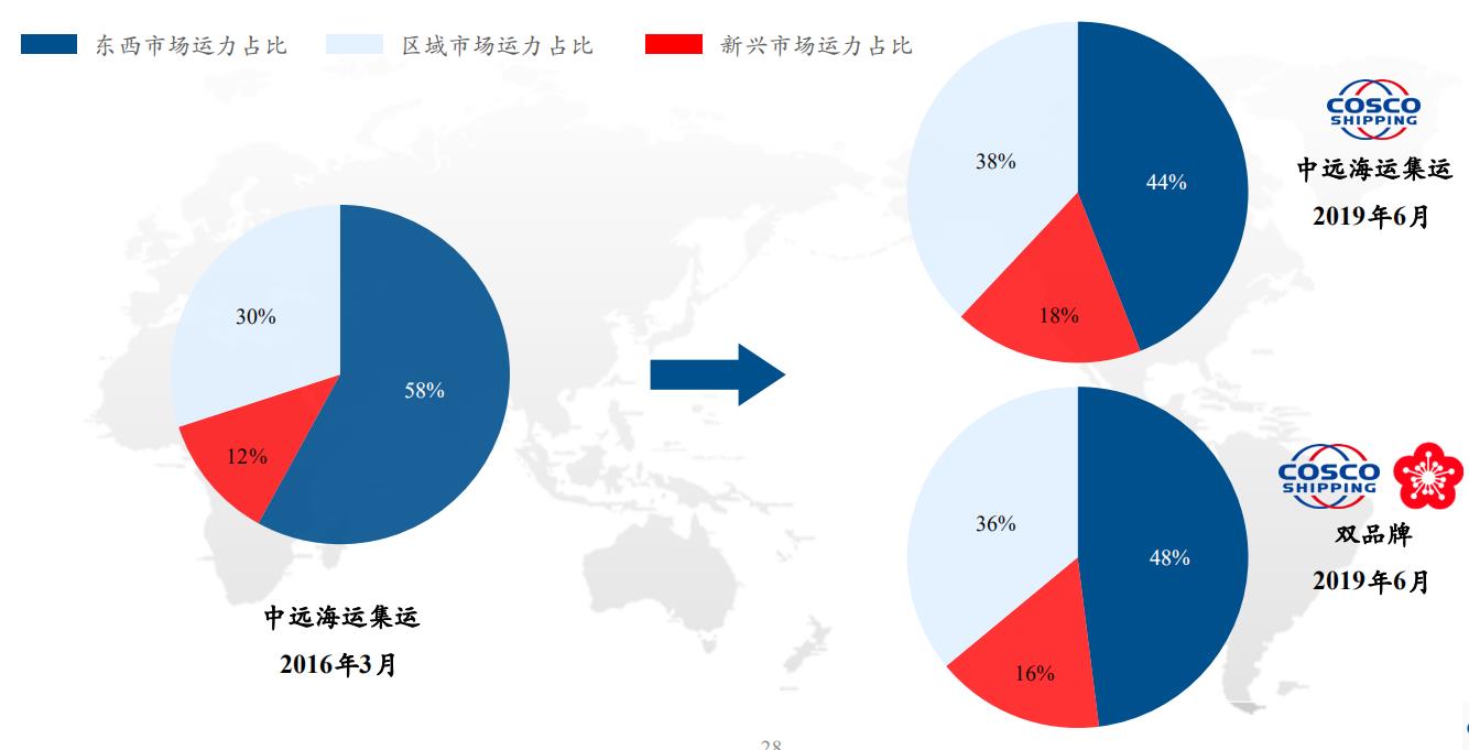 据介绍,随着不断开拓新兴市场和区域市场,中远海控的运力航线布局更加均衡和全球化。目前双品牌在新兴市场和区域市场的运力投放比例已分别提升至16%和36%,与此同时,中远海控从2018年上半年开始主动减少跨太平洋航线的投入与布局。