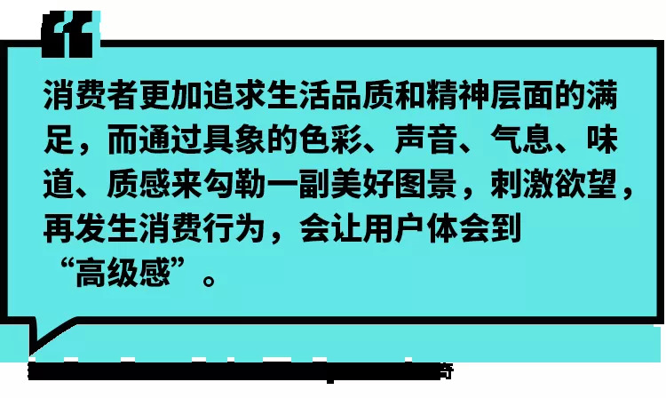发展到现在,消费者更加追求生活品质和精神层面的满足,而通过具象的色彩、声音、气息、味道、质感来勾勒一副美好图景,刺激欲望,再发生消费行为,会让用户体会到“高级感”。
