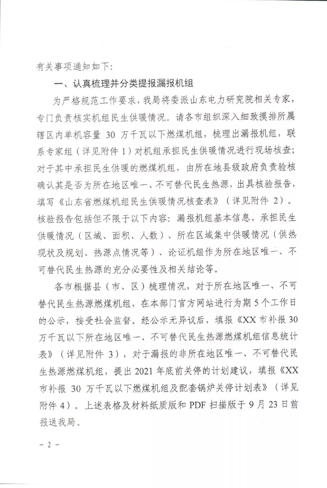 《通知》中表示,近期山东省各市根据《山东省人民政府办公厅关于严格控制炭消费总量推进清洁高效利用的指导意见》(鲁政办字[2019]117号)等文件有关部署要求,梳理了辖区内单机容量30万千瓦以下燃煤机组信息,对于漏报的非所在地区唯一、不可替代民生热源燃煤机组,提出2021年底前关停的计划建议。