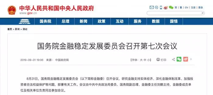 8月31日,国务院金融稳定发展委员会召开会议,研究金融支持实体经济、深化金融体制改革、加强投资者合法权益保护等问题,部署有关工作。会议由中共中央政治局委员、国务院副总理、金融委主任刘鹤主持,金融委成员单位及相关单位负责同志参加会议。