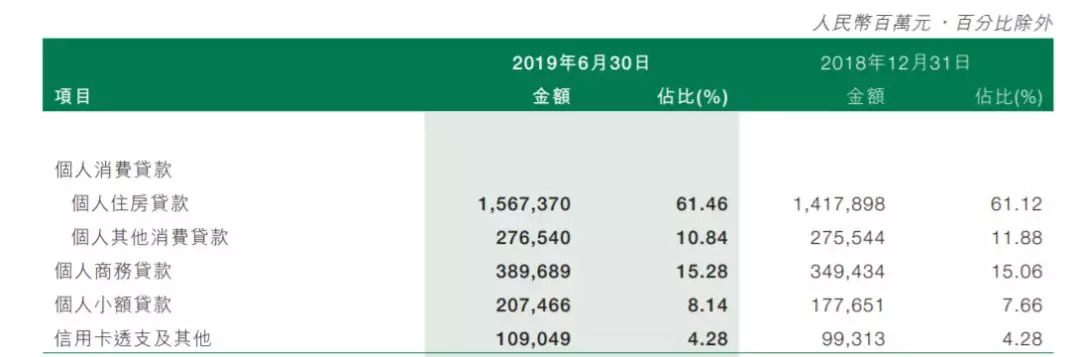 截至2019年6月末,上海银行个人贷款和垫款余额2905亿元,其中消费贷款余额为1634亿元,占比56.25%;信用卡余额319亿元,占比10.98%;住房按揭贷款为802亿元,占比27.61%;个人经营性贷款149亿元,占比5.13%。