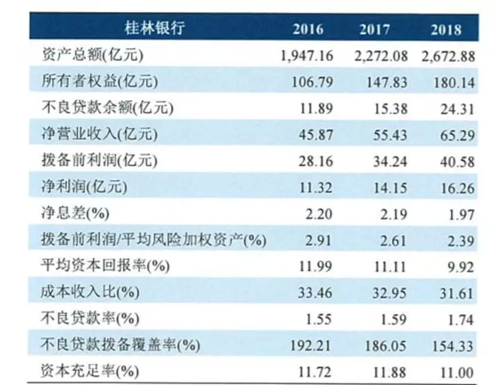 2016年-2018年,桂林银行分别实现营业收入45.87亿元、55.43亿元、65.29亿元,净利润分别为11.32亿元、14.15亿元和16.26亿元;不良率分别为1.55%、1.59%和1.74%。