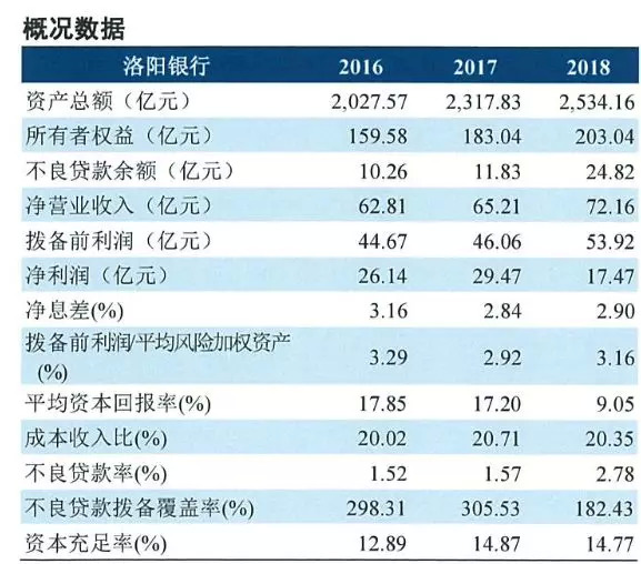 2018年,洛阳银行实现营业收入72.16亿元,拨备前利润53.92亿元,净利润17.47亿元,拨备高达36亿元。2018年,洛阳银行不良贷款余额为24.82亿元,比2017年的11.83亿元猛增13亿元,不良贷款率为2.78%,远远高于2017年的1.57%。