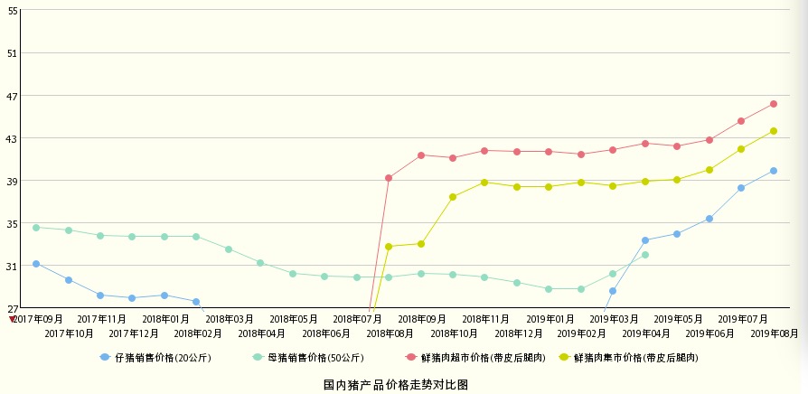 农业部数据显示:8月26日猪肉出厂价报价32.27元/公斤,到了8月30日达33.57元/公斤,上涨幅度较快。鲜猪肉超市价格在8月份达到46.25元/公斤,这一价格在去年同期为39.27元/公斤,上涨幅度较大。