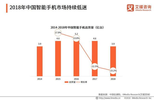 iiMedia Research (艾媒咨询)数据显示,2018年中国智能手机出货量大幅下降,智能手机整体出货量为3.9亿台,较2017年下降11.7%。中国智能手机市场在经历2016年换机潮的大幅增长后逐渐趋于饱和,另外,智能手机性能的提升使用户换机周期延长加剧了中国智能手机市场低迷状态。