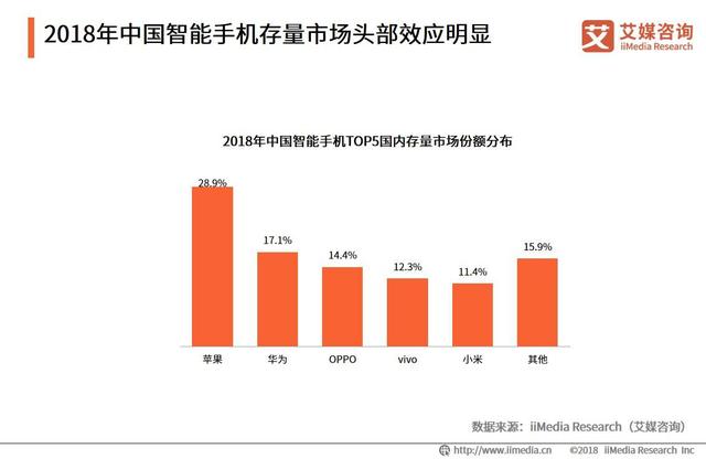 毫无疑问,智能手机市场的竞争已经深处红海。iiMedia Research (艾媒咨询)数据显示,2018年中国智能手机增量市场数据佐证了国产智能手机品牌竞争力在逐渐提升,但由于新增体量较存量市场规模差距较大,因此全年的存量市场份额仍以苹果、华为、OPPO、vivo、小米为主。