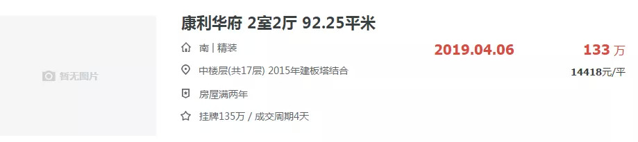 据链家二手房挂牌显示,康利华府均价已高达14468元/㎡,今年4月6日曾成交一套房源,单价14418元/㎡,倒挂超5000元/㎡。同板块二手房万科城、中南锦城等,二手房均价在13161-14786元/㎡不等。