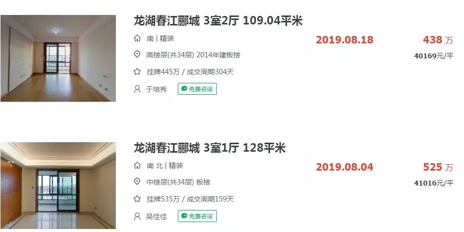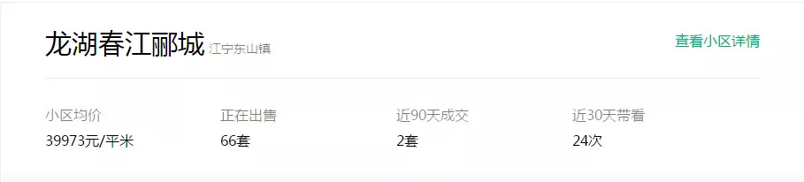 龙湖春江郦城项目目前住宅仅剩D6待加推,面积115㎡,共计80套左右,项目在2017年加推是销许均价为29000元/㎡左右,目前项目在链家上的二手房挂牌价为39973元/㎡。8月成交的两套房源,单价均超40000元/㎡。