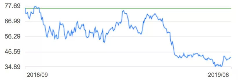 用户的流失直接体现在微博的年线图上。截至发稿,微博的市值仅为93亿美元,每股收41.37美元。一年前,每股是76美元。