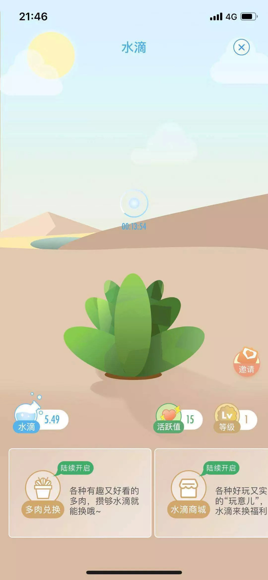 比如,在个人主页的右上角,有一个水滴状的按钮,点击进入后会看到沙漠中的一棵植株,类似于蚂蚁森林。这是绿洲内的积分系统。通过邀请注册、发送动态可以积累水滴,水滴可用于兑换福利、打赏内容和投票打榜。