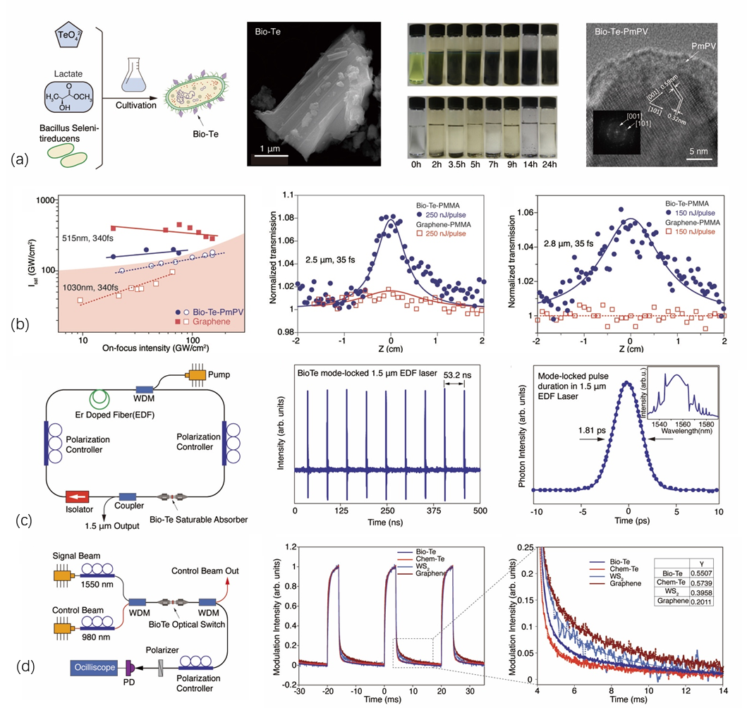 在这项研究中,研究人员通过培养从美国加州莫诺湖(Mono Lake)中提取的一种芽孢杆菌(Bacillus Selenitireducens)合成了单质Te纳米微晶。超快非线性光学研究表明Te纳米微晶具有从可见到中红外(515 nm至2.8 μm)的广域饱和吸收性质,覆盖的波长跨度和饱和吸收系数在红外端超过了石墨烯。