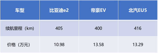 尽管比亚迪e2的续航里程上限相较于帝豪EV和北汽EU5要短一些,但通过上图可以发现,在续航里程相近的情况之下,比亚迪e2的价格要低得多。