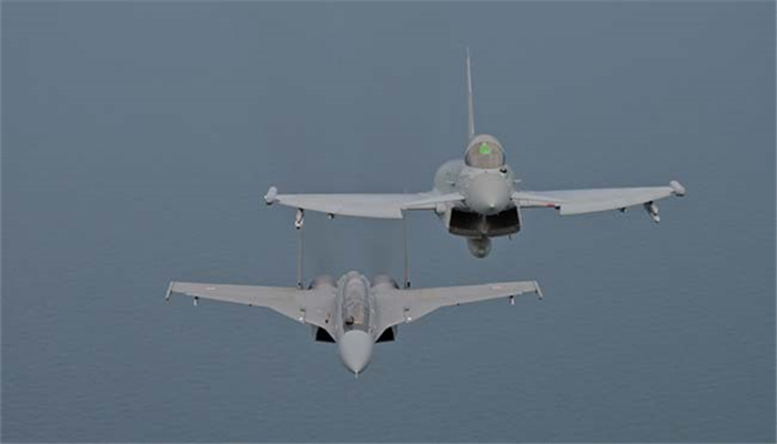 随后演习又升级为二对二空战,两架台风战机和苏-30战机进行狗斗。接下来还有二对一空战,两架苏-30战机对阵一架台风战机,反之亦然。值得一提的是,在一对二空战中,一架苏-30战机将两架“敌军”战机都“击落”了。