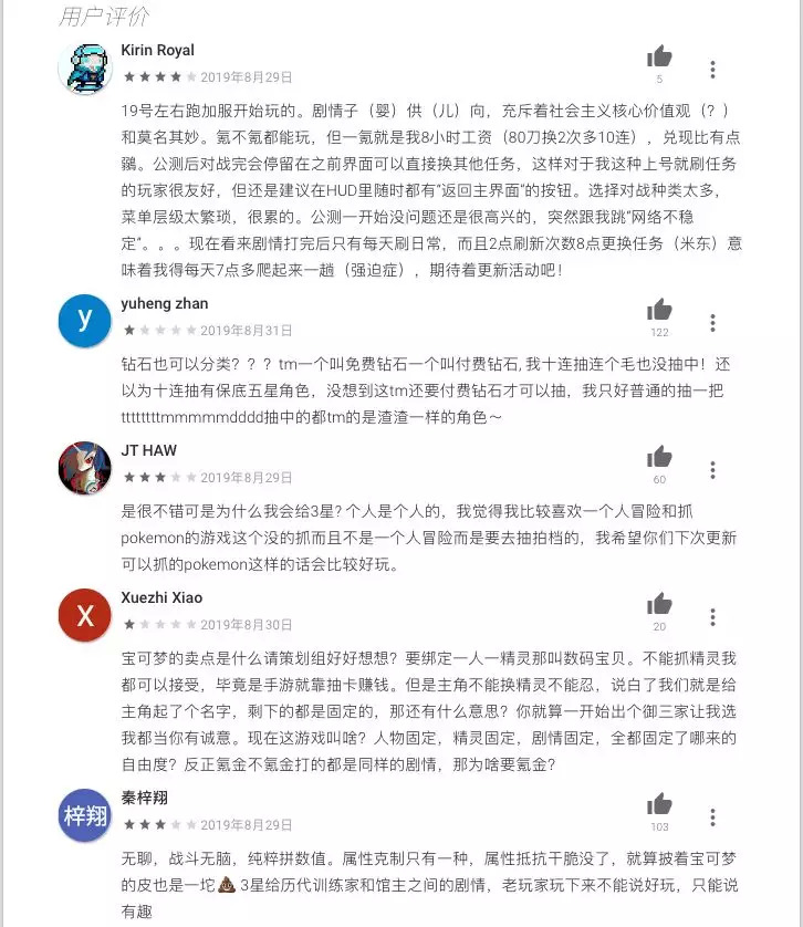 以Google Play为例,新作在超过12.7万个评分中,仅拿到了3.6分(满分5.0分),除了部分玩家以“网络不稳定”为由给出负评之外,更多的不满,则是直指游戏的玩法系统。