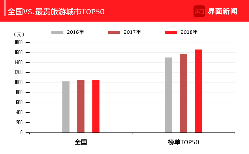 根据2019年5月发布的《中华人民共和国文化和旅游部2018年文化和旅游发展统计公报》显示,2018年全国旅游总收入达到5.97万亿元,国内旅游总人数为55.39亿人次,入境旅游人数1亿4120万人次。全国人均旅游消费为1051元,与去年相比,基本持平。今年最贵旅游城市TOP50的旅游人均消费达到1660元,而去年榜单前50的人均消费只有1575元,相比之下上涨约5%。