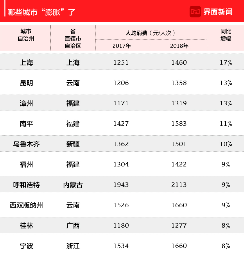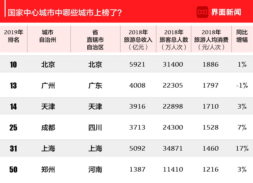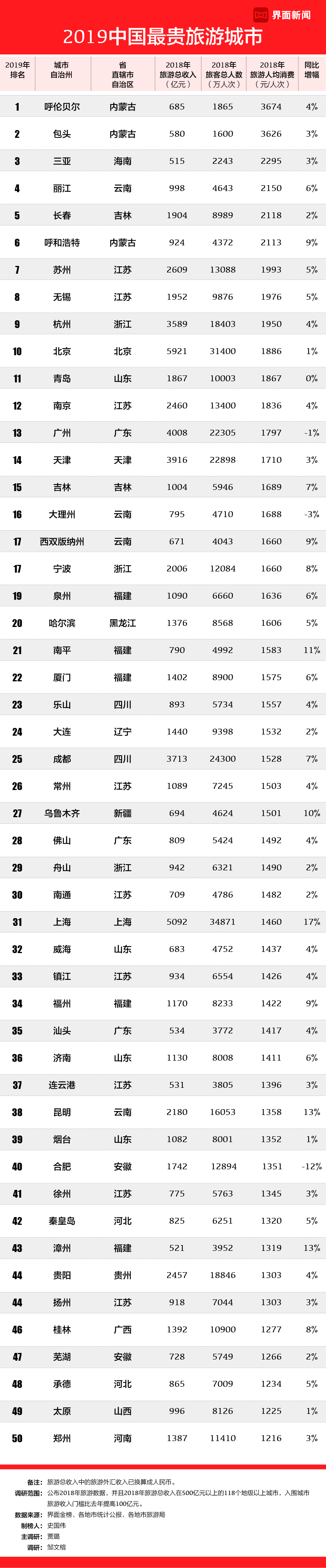 金秋十月,攒了大半年的积蓄终于可以在国庆长假期间挥霍了。离开工作生活的城市,踏上异乡的路。不管是和家人一起去看海,还是约三五好友去大草原上策马奔腾,似乎都需要“强大”资金的支持。土豪就算了,作为爱生活也爱钱的我们,出发之前除了要做好出行攻略,还要关注一下各个旅游目的地城市的人均消费,避免节前吃肉,节后吃“土”的情况发生。界面2019年最贵旅游城市榜今日出炉,下面我带着您,您带着钱,一起去看看最贵旅游城市都有哪些。