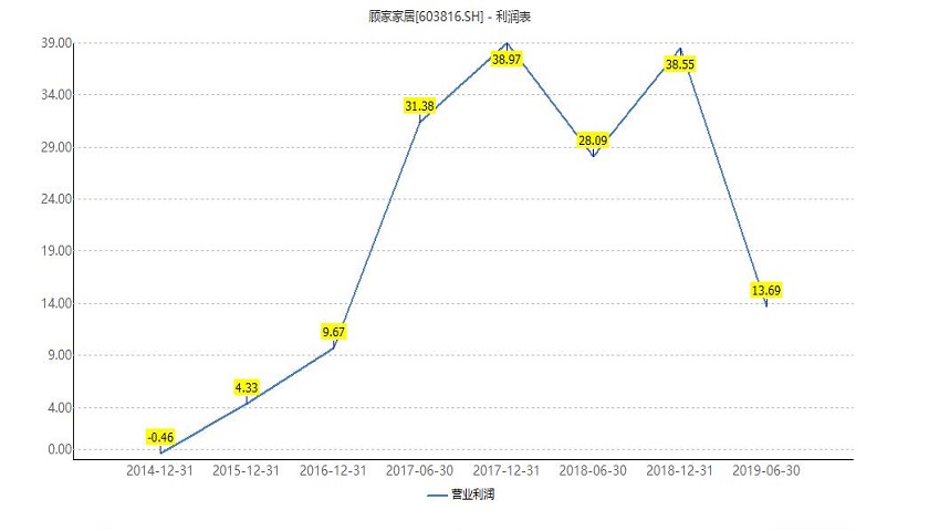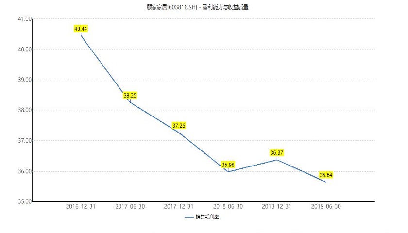 不仅如此,顾家家居的净利润增速也创了新低。顾家家居毛利率已连续下滑多年,2019年上半年顾家家居的毛利率下降1个百分点,创出了新低35.6%。因此,顾家家居归母净利润增速只有15.8%,不及营业收入增速。
