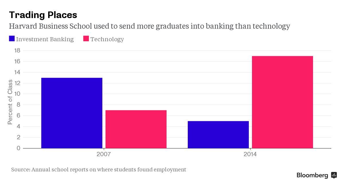 诞生了许多亿万富翁的硅谷让暮气沉沉的投资银行业倍感压力,并迫使其削减开支、规避风险。今年,哈佛MBA毕业生进入银行业工作的人数来到历年最低值,尽管有许多大公司已经采取诸多新措施向新职员示好。2007年,有13%的商学院毕业生去到了投资银行业或者贸易领域就职,去年,这一比例降到了5%。