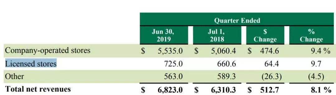 特许经营门店带给星巴克的收入主要来自商品和设备出售,以及特许权使用费等。2019年第二季报星巴克的财报显示,其特许经营门店收入为7.25亿美元,同比增长9.7%。