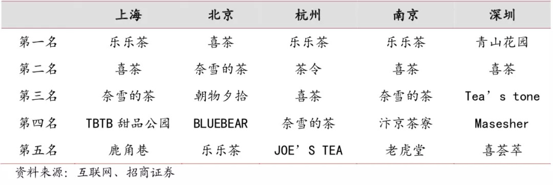 按照大众点评的搜索结果,以饮品店为输入项并以人气为排序条件,上海地区排名前三的饮品店门店为乐乐茶、 喜茶与奈雪的茶,南京与杭州地区的检索结果也相差不大。