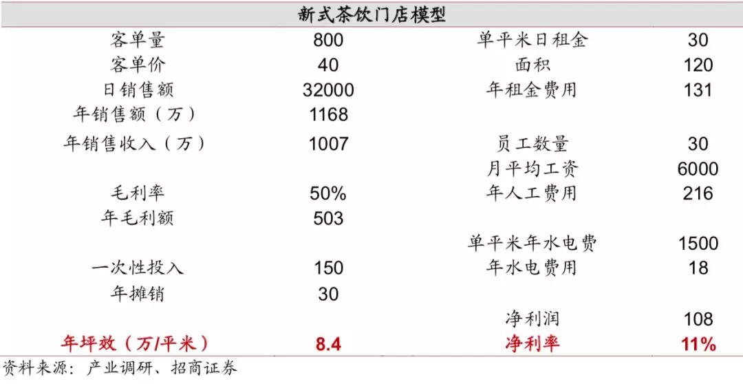 基于产业和草根调研我们拆解出成熟的头部新式茶饮店的单店模型,从模型来看,如果在客单量800,客单价40元,毛利率50%的情况下,年销售收入达千万左右,净利润百万左右,净利率11%,和其他零售业态相比利润率可观。主要原因在于高坪效和高毛利,费用端人工和租金占比较高,初期一次性投入的回收期大概在1.5年左右。