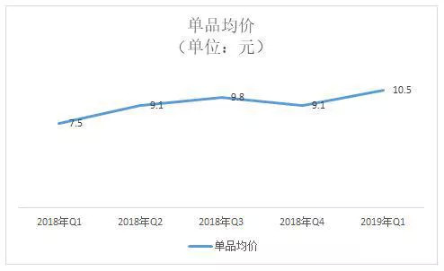 客单价和定价上,客单价指标的月度数据是自瑞幸咖啡成立以来,首次达到75元/人;2018年第四季度由于大量的补贴和疯狂促销,使其单品均价低至8.3元,而2019年第一季度回升到9.1元,这个季度单品均价回升到10.5元,其中咖啡单品价格为10.4元。