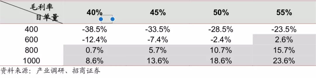 进一步对单店模型进行敏感性分析,发现净利率对于日单量极度敏感,日单量减少200单,带动净利率最高能有20+pct 的波动,在假定40元客单价的情况下,800单左右是一个门店前台的盈亏平衡点。