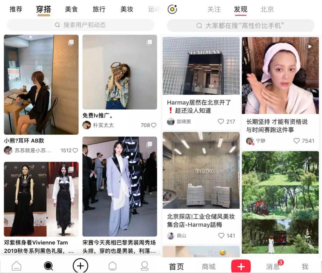 搜索分为穿搭、美食、旅行等十个领域,囊括当下几乎全部的年轻文化。相较于主页,搜索更能让用户准确找到兴趣内容。图片+文案+心型点赞的排版,怀疑俩产品请了一波设计师。