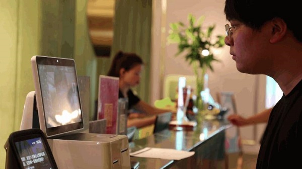 进入在静安区天目西路上的漫心酒店,前台有两台“华掌柜”,这是自助办理入住手续的终端。显示屏上设有“入住”“退房”“续住”“发票”等按钮,用户轻轻按“入住”,机器人立即提示用户扫描身份证、人脸识别,随后便“吐”处一张房卡。记者看到,通过这台“华掌柜”办理入住手续,用户办理入住时间由平均20分钟缩短到10秒钟。