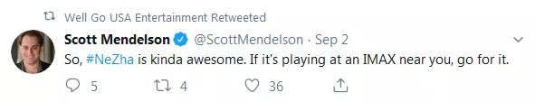 9月6日,《哪吒》将在北美大规模上映,按照《哪吒》目前在北美的口碑发酵以及票房成绩。我们有信心《哪吒》是能够冲刺到 Well Go USA 最佳电影票房。介时,超过《战狼2》270万美元,《美人鱼》328万美元,甚至《流浪地球》587万美元。成为近五年最高北美票房国产片不无可能。