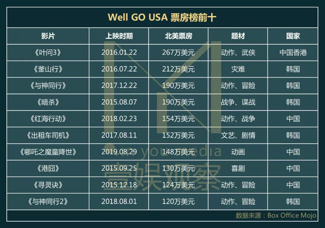 而现象级灾难题材影片《釜山行》,是韩国最高票房212万美元。值得注意的是,韩国的系列影片《与神同行》同时打入北美市场,均获得百万美元票房。