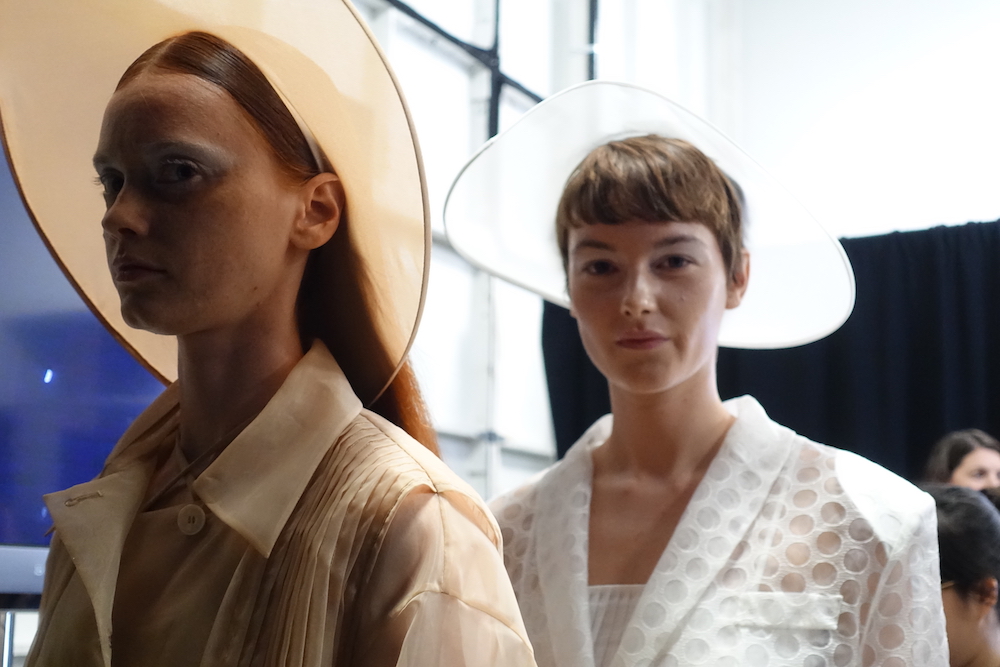 这种“大道至简”的美学观念在近几年来正受到市场的偏爱。飘逸的薄纱孔状上衣和褶皱裙,以及模特头顶看似柔软但挺立的帽饰和冰蓝色薄纱,宛若李清照和柳永笔下那些醉酒消愁女性的写照。
