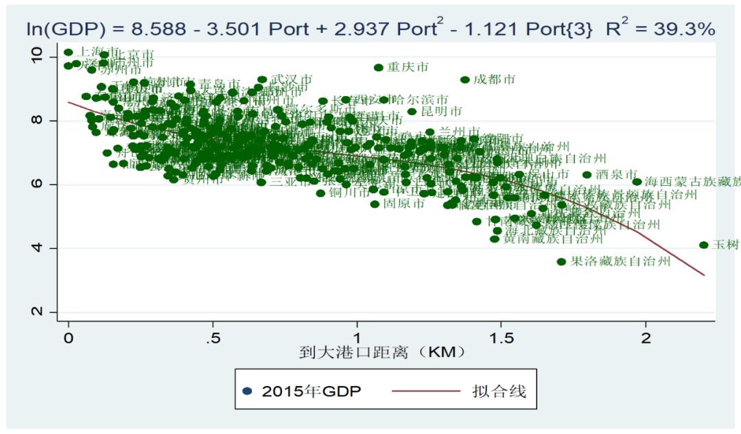 我的数据分析显示,仅“到沿海大港口的距离”这一个变量,就可以解释城市之间GDP总量差异的接近40%,即越远离沿海大港口的城市GDP的总量就越小。再看中国的GDP和人口空间分布。把中国的城市按照GDP规模从高到低排序,到所有城市占中国GDP的50%时结束,能发现中国的GDP集中分布在沿海地区和内地的省会城市,这是由于现代经济发展带来的空间集聚。