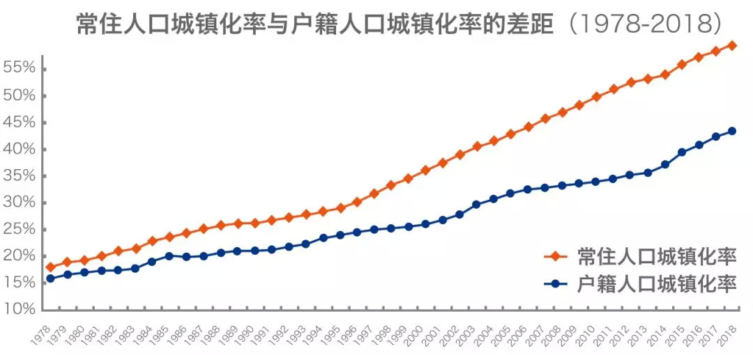 2014年,国务院发布《国家新型城镇化规划(2014-2020)》,提出“常住人口城镇化率达到60%左右,户籍人口的城镇化率达到45%左右”的目标。2018年末,我国常住人口城镇化率已经达到59.5%,很接近“规划”目标,户籍人口城镇化率只有43.37%,构成差距的主要部分是生活在城市但没有城市户籍的流动人口,他们被称作“外来人口”。