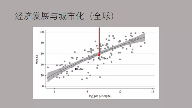 “中国经历了人类历史上速度最快的城市化进程”是正确的,问题是,如果在国际化的视野里看两个变量之间的关系,相比其他和中国经济水平相同的国家,中国的城市化率水平偏低了接近10%。