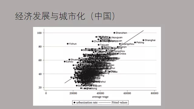 第二张图,我把中国单独拿出来,看中国每个城市的城市化率和收入水平之间的关系,得出的结论是:收入水平高的城市,城市化率越高。这两张图告诉大家,城市化率的不断提高和经济发展水平有关,这是全球的普遍规律,是不得违背的客观规律。