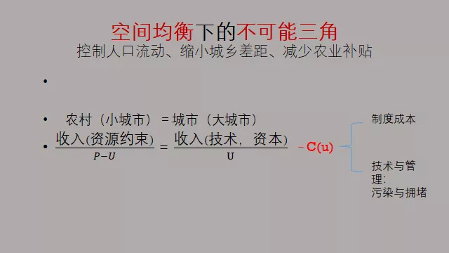 中国有没有可能走出一条独特的道路?很多人找出各种各样的原因,比如中国的人地矛盾、中国人口众多、城市没有做好制度准备、农村也没有做好准备……认为城市化率到60%就不要提高了。但是,这样的论述中存在“不可能三角”:第一个目标是控制人口流动,也就是城市化率不要提高;第二是缩小城乡差距;第三是减少农业补贴。这三个目标不可能同时实现。