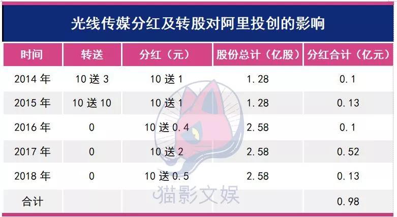 届时,光线传媒正在进行年末分红,10送1,力度很大。后续每年光线传媒都会进行分红,从10送0.4到10送2,其中2014年和2015年都有转送股。如果整体计算下来,阿里创投这5年获得的分红累计达到了0.98亿元。由此可以看出,光线传媒对股东还是很大方的。